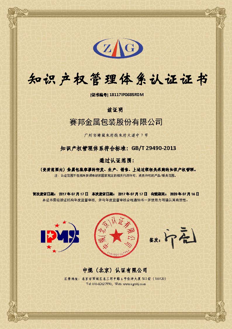 2017年7月17日,賽邦股份正式獲得《知識產權管理體系認證證書》,由此成為率先通過國家知識產權局《企業知識產權管理規范》認證的企業之一,目前成為金屬包裝行業唯一通過認證企業。